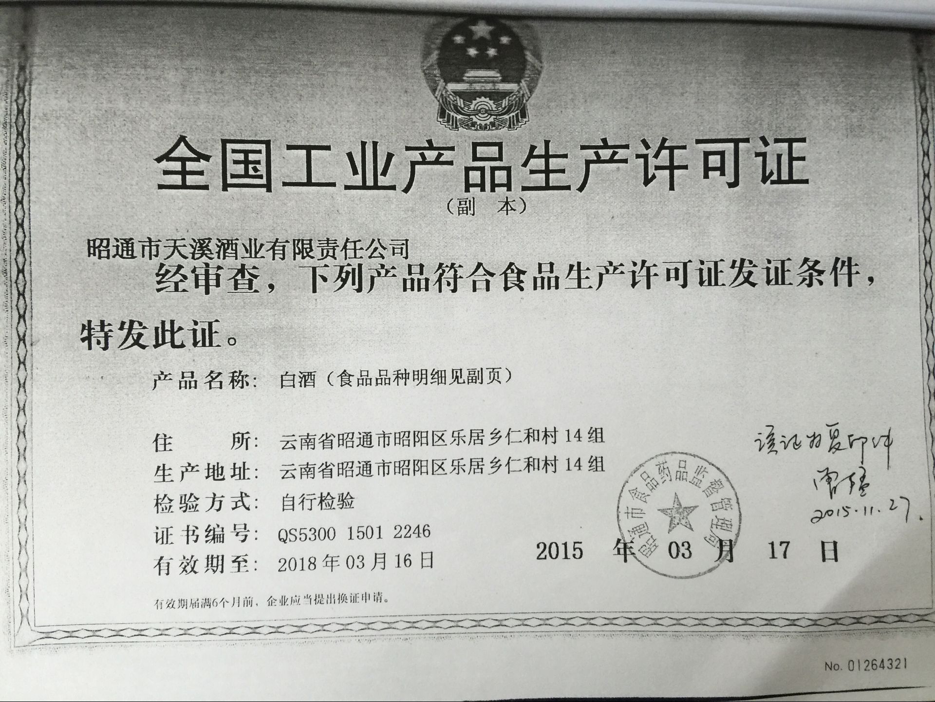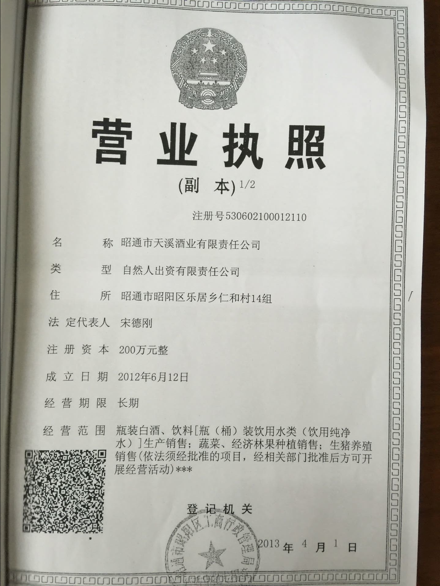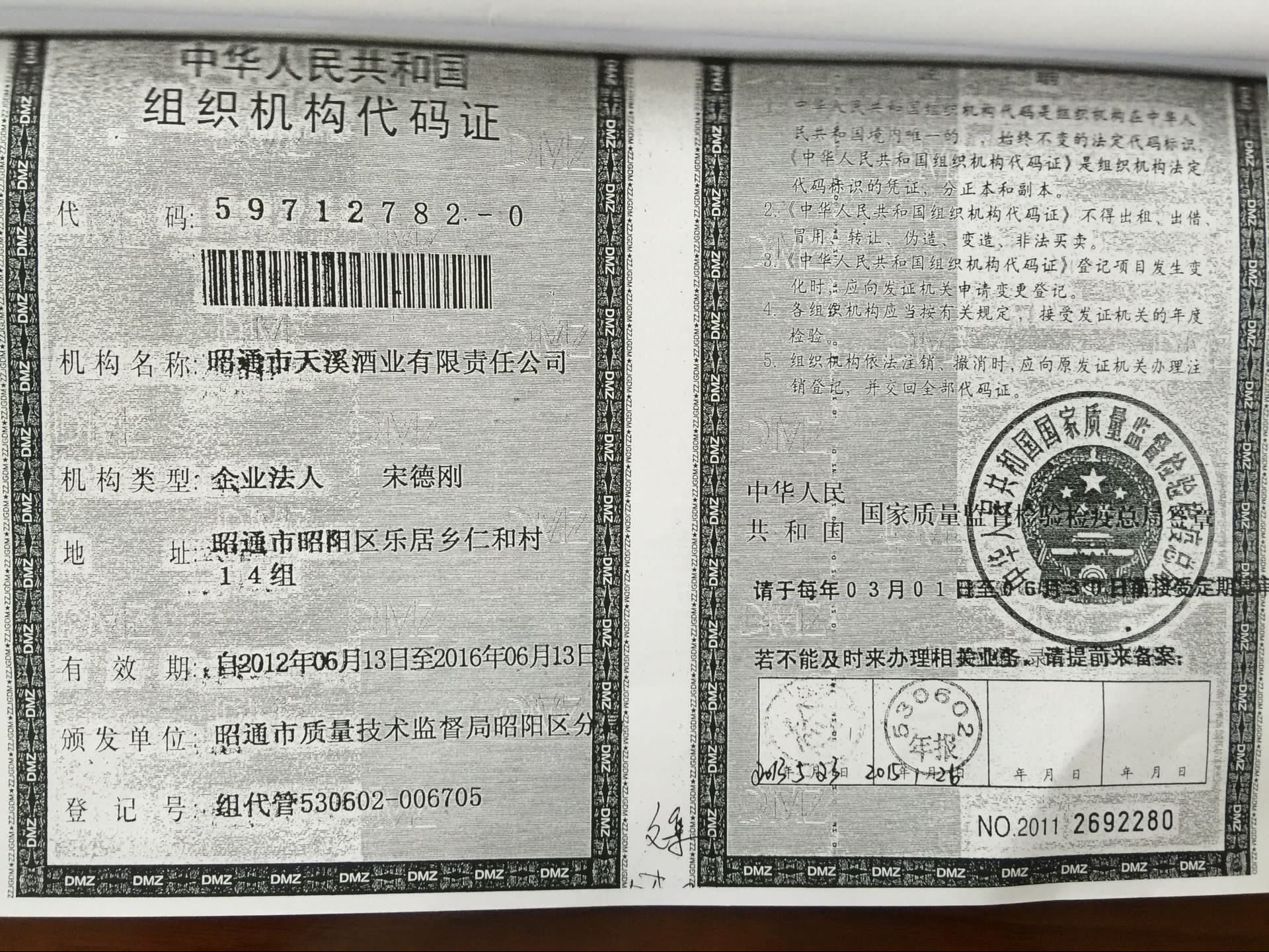 昭通市天溪酒業(yè)有限公司資質(zhì)證照復印件