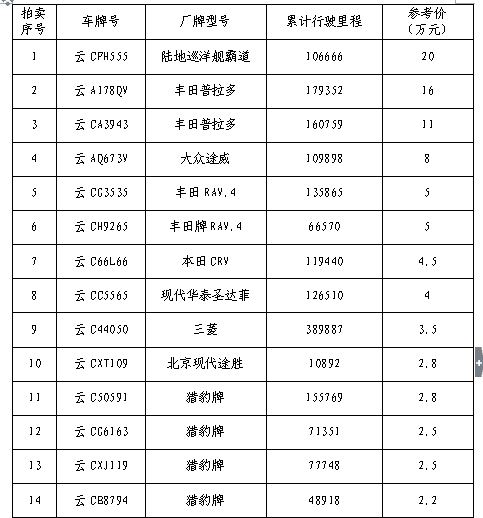 經(jīng)鎮(zhèn)雄縣人民政府批準(zhǔn),受鎮(zhèn)雄縣國(guó)有資產(chǎn)管理局委托,公開(kāi)拍賣鎮(zhèn)雄縣公車20輛。以輛為單位拍賣。相關(guān)事項(xiàng)如下: