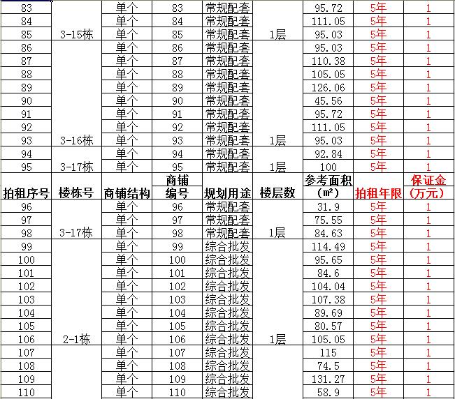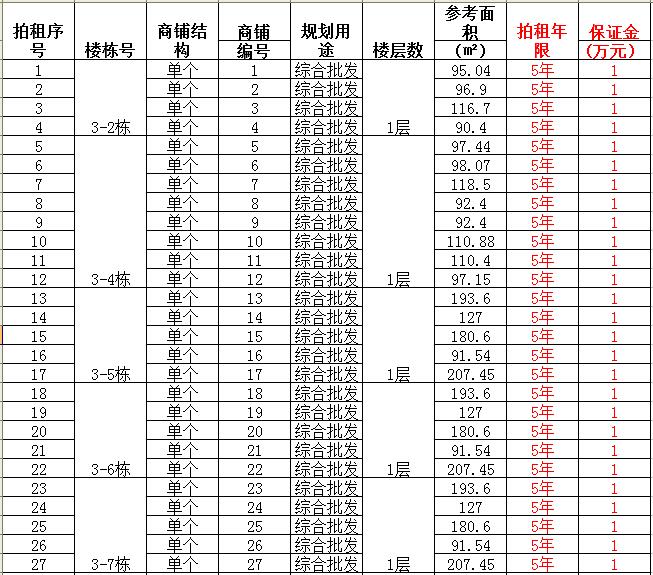 (一)拍租單個(gè)商鋪129間,使用期5年,每間商鋪預(yù)交競(jìng)租保證金1萬(wàn)元, 詳見商鋪簡(jiǎn)介(欲競(jìng)租多間商鋪,保證金類推);